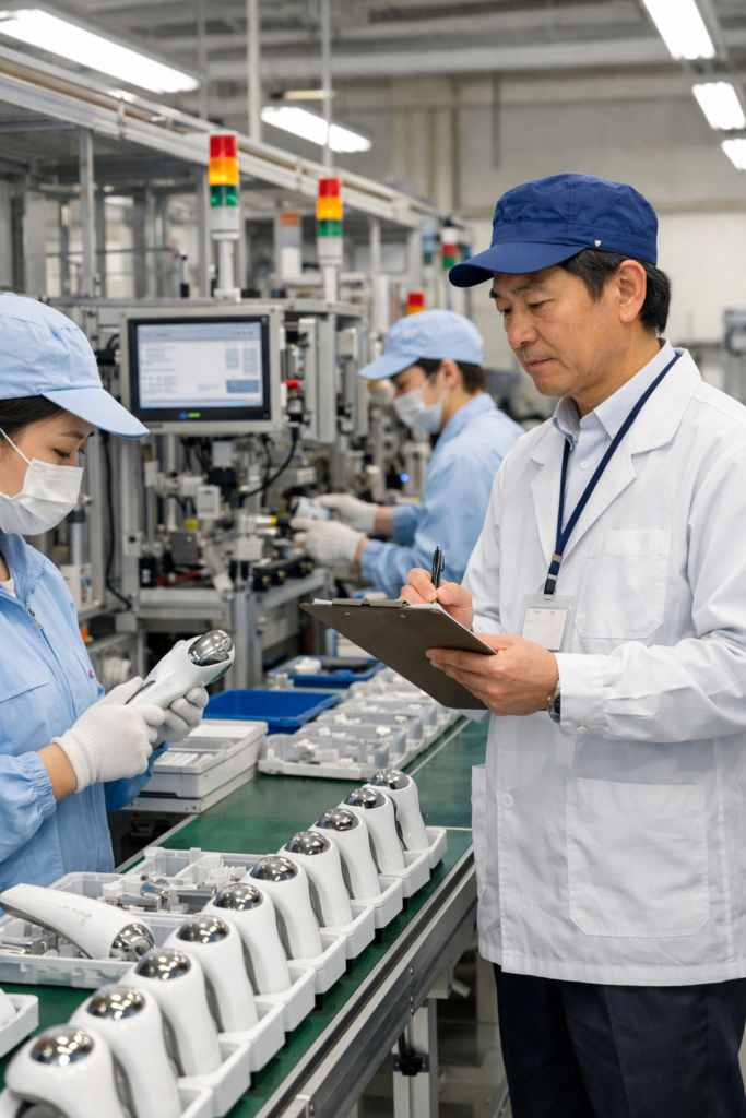 このたび弊社スタッフが、美容機器の製造工場を視察いたしました。弊社拠点の近隣エリアには関連工場が集約しており、部材調達から組立、検査、梱包まで一連の工程を短い移動距離で完結できる生産環境が整っています。今回視察した工場は、先端設備を備えた美容機器の製造拠点として、量産体制はもちろん、試作・改良にも柔軟に対応できる点が特長です。製造ラインでは工程ごとの標準化が徹底され、受入検査・工程内検査・出荷前検査など、複数段階での品質チェックが行われていました。外観・動作・安全性の確認に加え、必要に応じてロット管理や検査記録の整備も可能で、安定した品質を確保する仕組みが構築されています。